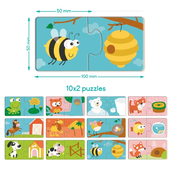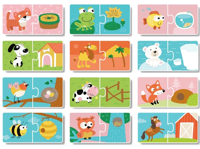 Copilul potrivește jumătățile puzzle-ului, asociind animalul cu căsuța lui — iar fiecare alegere corectă aduce bucuria descoperirii.