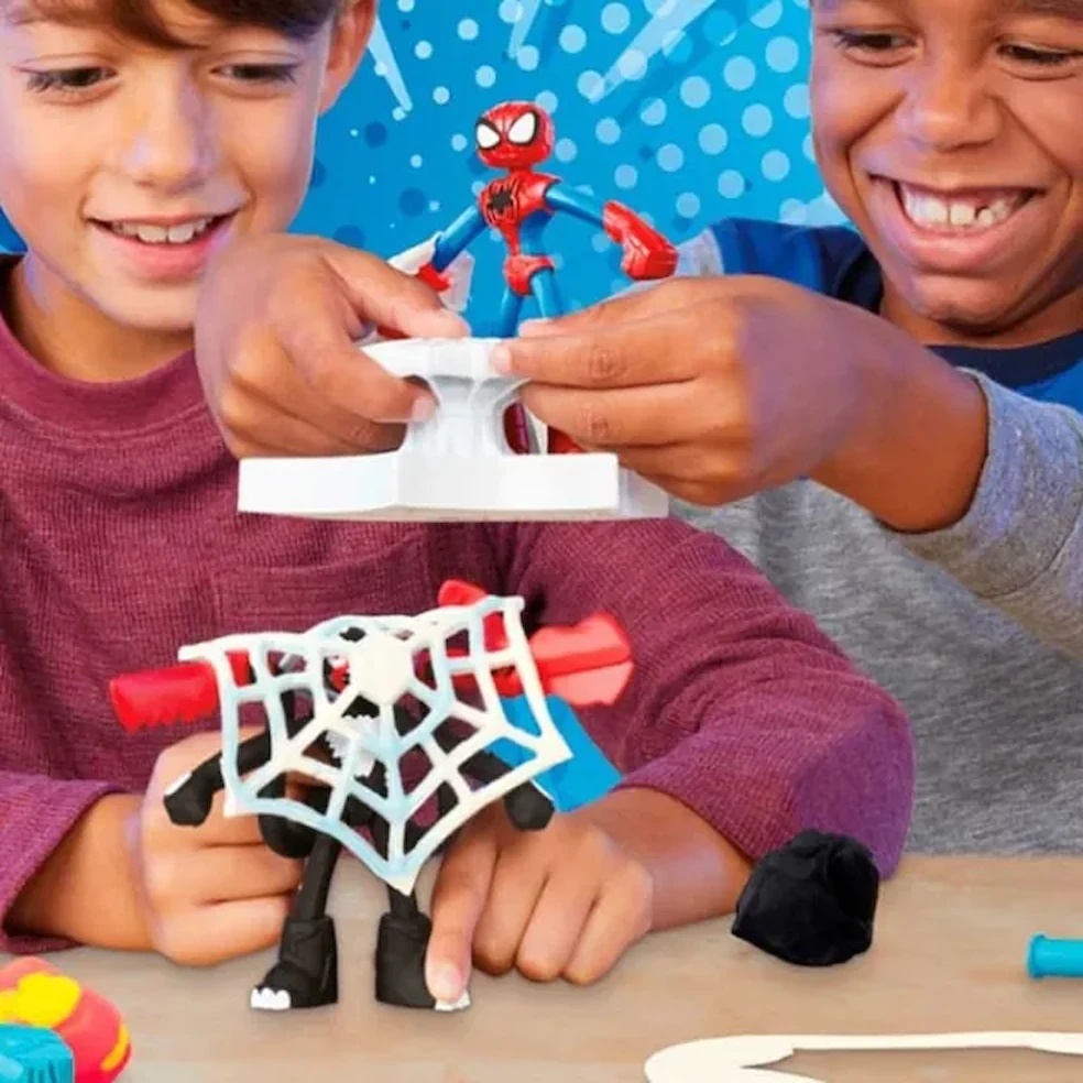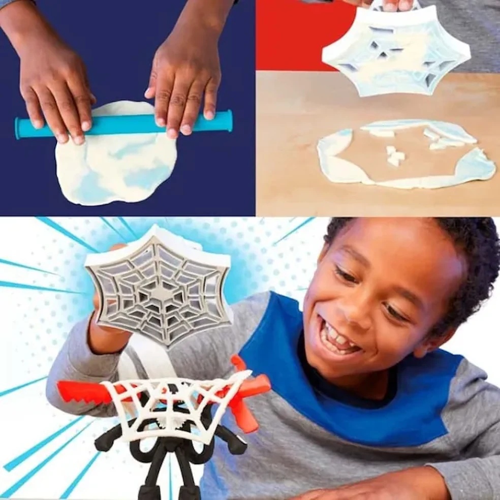 Folosește seiful pentru a modela bani, bijuterii și lingouri de aur pe care Venom să le fure, apoi imaginează-ți cum figurina Spider-Man vine în zbor pentru a salva situația, folosind scutul din pânză Play-Doh și uimitoarea sa lansatoare gigantică de pânză! Rola îi ajută pe copii să întindă compoziția Play-Doh la grosimea potrivită, astfel încât să poată aplica ștampila cu ajutorul lansatorului, apoi să apese butonul pentru a lansa pânza și a-l prinde pe Venom.