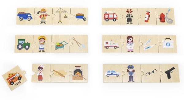 Copilul trebuie să potrivească 6 plăcuțe de bază cu ilustrații ale diferitelor profesii — pompier, doctoriță, polițist, fermier, constructor și brutar — cu 18 puzzle-uri cu unelte și vehicule asociate acestor profesii.