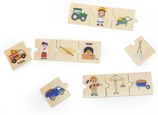 Setul de puzzle-uri din lemn „Profesii și unelte” de la brandul VIGA este alegerea ideală pentru copii de la 18 luni. Produsul permite învățarea prin joacă, introducând micuții în lumea culorilor și a diferitelor profesii.