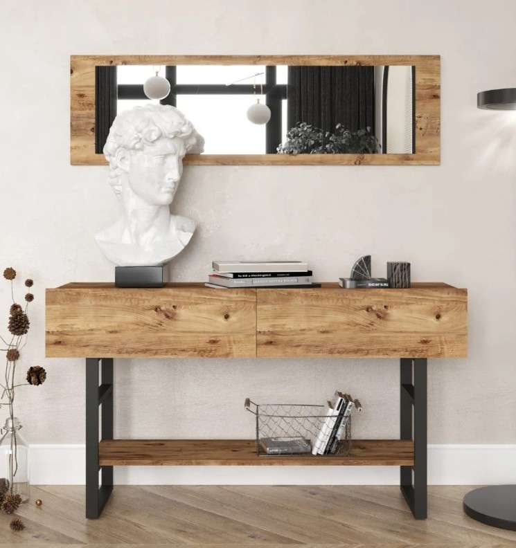 Consola este prevăzută cu o oglindă, perfect dimensionată pentru a-i completa dimensiunile. Nu numai că oglinda adaugă o notă de eleganță, dar are și un scop practic, permițându-vă să vă verificați aspectul înainte de a ieși pe ușă.