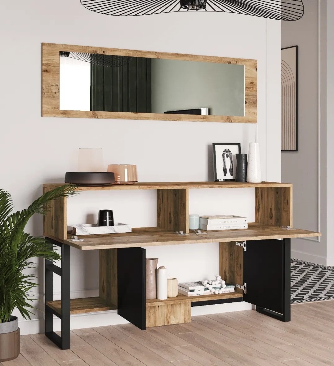 Având o cantitate generoasă de rafturi, această consolă oferă un spațiu de depozitare amplu pentru toate bunurile dvs. De la cărți și obiecte decorative la dispozitive electronice și multe altele, puteți păstra totul organizat și la îndemână. Oglinda inclusă adaugă o notă de eleganță și funcționalitate, făcându-l perfect pentru rutina zilnică de îngrijire.