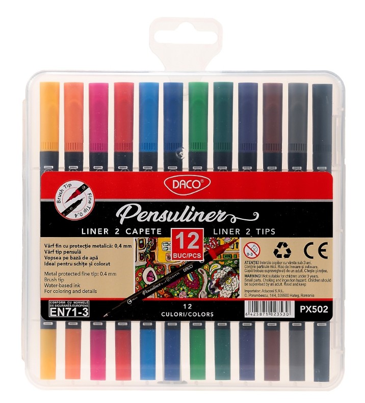 Setul de Pix Pensuliner DACO conține 12 pixuri versatile, perfecte pentru desen, caligrafie, și proiecte de artizanat. Fiecare pix dispune de două capete: unul cu vârf fin de 0,4 mm pentru linii precise și unul tip pensulă pentru umpluturi colorate și detalii deosebite.