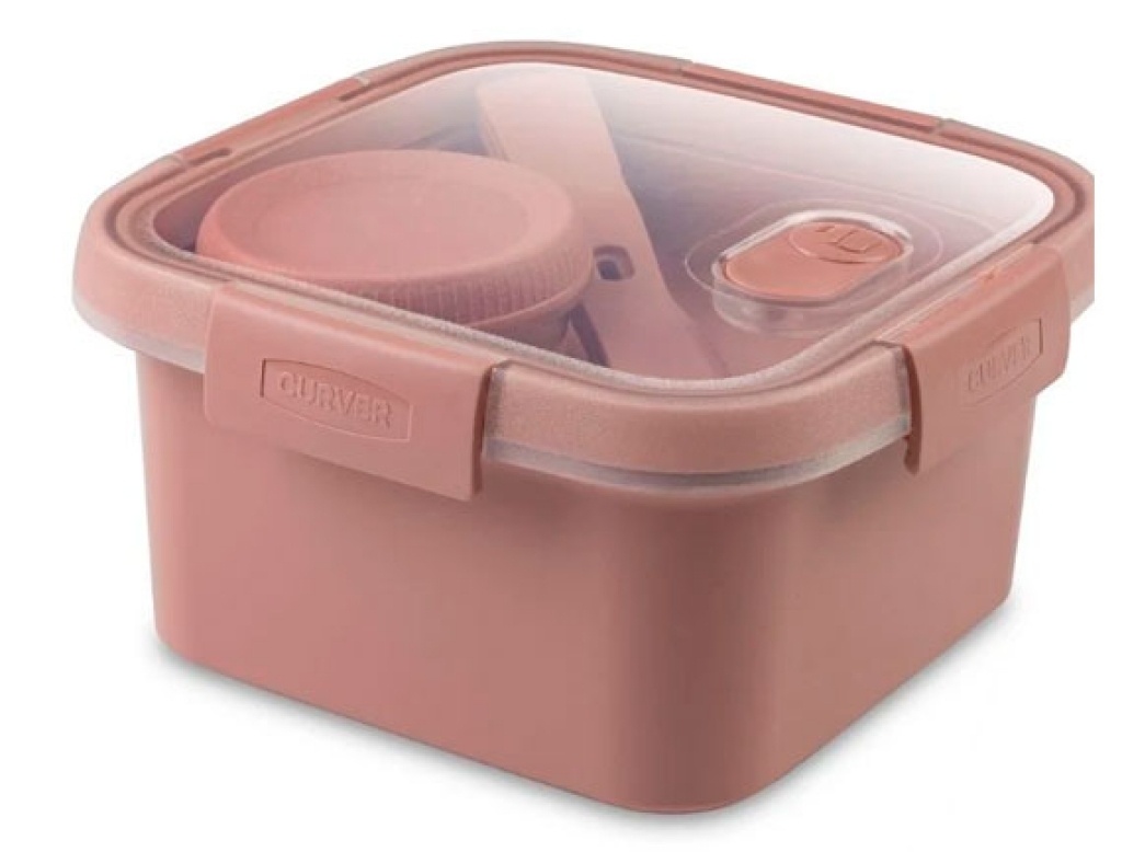 Cutia de prânz din colecția Smart To Go este pătrată și are o capacitate de până la 1100 ml, fiind perfectă pentru depozitarea prânzului. Puteți lua cu ușurință prânzul la serviciu în ea – paste, salată sau chiar mâncăruri lichide precum lecho sau tocană. Raftul detașabil din interior vă permite să depozitați articole precum pâine, iar recipientul cu capac cu filet conține sos, dip sau iaurt. Este fabricată din plastic roz sigur, fără BPA, și are o închidere cu clic. Avantajul său principal este etanșarea etanșă, care previne scurgerea conținutului, permițându-vă să transportați cu ușurință recipientul în poșetă sau rucsac.