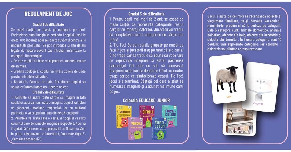 Pachetul conține Educard Junior Primele cuvinte și Educard Junior Forme și culori. Pachetul Primele cuvinte conține 50 de cărți de joc, grupate pe cinci categorii pe care copilul trebuie să le identifice: Ferma; Grădina zoologică; Bucătăria; Camera de baie; Dormitorul. Fiecare categorie este formată din 10 cărți de joc: o singură carte reprezintă categoria, celelalte 9 cărți reprezentând imagini care trebuie identificate și așezate de către copil în dreptul cărții ce indică acea categorie. Jocul îi ajută pe cei mici să recunoască și să numească obiecte și ființe familiare, precum și să le sorteze pe categorii. Jocul de inteligență conține 3 grade de dificultate, în funcție de capacitatea de învățare a copilului. Pachetul Forme și culori conține: 45 de carduri cu forme geometrice și simboluri în diferite culori; 5 carduri-joker. Sunt utile atât pentru învățarea culorilor și formelor, cât și pentru dezvoltarea atenției și vitezei de reacție. Jocul de inteligență conține 3 grade de dificultate, în funcție de capacitatea de învățare a copilului.