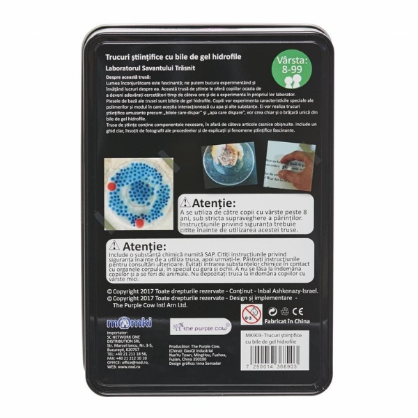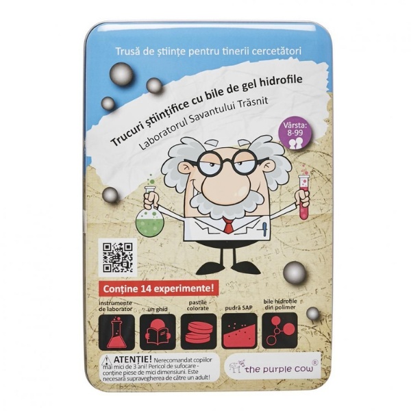 Această trusă de științe le oferă copiilor ocazia de a deveni adevărați cercetători timp de câteva ore și de a experimenta în propriul lor laborator. Piesele de bază ale trusei sunt bilele de gel hidrofile. Copiii vor experimenta caracteristicile speciale ale polimerilor și modul în care aceștia interacționează cu apa și alte substanțe. Ei vor realiza trucuri științifice amuzante precum bilele care dispar și apa care dispare, vor crea chiar și o brățară unică din bile de gel hidrofile.