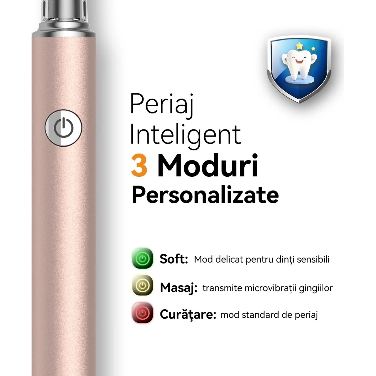 - 3 moduri inteligente de periaj Soft – periaj delicat pentru dinți sensibili Masaj – microvibrații relaxante pentru gingii sănătoase Curățare – modul standard, ideal pentru o igienă completă.