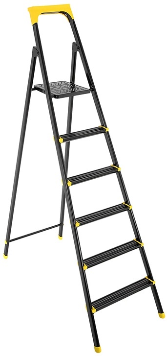 Scara metalică, vopsită în negru, modelul EUROSTEP LEO cu configuraţia 5+1 trepte este destinată lucrărilor casnice sau de mică complexitate. Structura este realizată din profil de oţel cu strat de vopsea aplicat prin pulverizare electrostatică, oferind rezistenţă la coroziune. Sarcina maximă admisă este de 150 kg. Treptele sunt striate pentru a preveni alunecarea. Platforma superioară adiţională („+1”) oferă stabilitate crescută în timpul lucrului. Modelul este compact şi uşor de depozitat, asigurând un mod de lucru sigur şi comod la înălţime redusă.