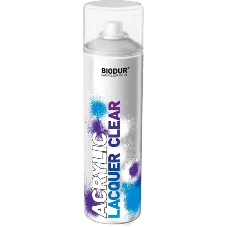 Lacul spray acrilic Biodur formează un strat transparent rezistent și lucios. Proprietatea unică a lacului Biodur este aceea de a îmbogăți orice culoare. Nu se decolorează la soare și rămâne lucios. Se recomandă utilizarea pentru lucrări exterioare și interioare. Pentru întărirea stratului de lac și crearea unui efect mat, se recomandă utilizarea ulterioară a lacului universal mat Biodur.