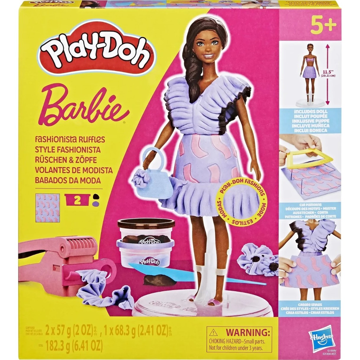 Creează ținute super drăguțe cu setul Fashionista Ruffles! Este ușor și distractiv să faci haine pentru păpușa Barbie din plastilină Play-Doh cu acest set creativ. Pur și simplu pune păpușa pe suport, folosește șablonul și formele pentru a tăia rochiile Barbie și îmbracă-o în cele mai creative moduri. Creează-i 2 coafuri diferite din Play-Doh folosind formele pentru păr scurt și lung sau fă-ți propriile coafuri manual. Adaugă accesorii pentru Barbie, cum ar fi geantă și pantofi, pentru a-i completa look-ul. Continuă jocul plin de imaginație cu 2 borcănașe de plastilină Play-Doh pentru a adăuga și mai multe detalii. Un cadou de modă minunat pentru copiii care iubesc seturile de joacă Barbie și jucăriile Play-Doh!