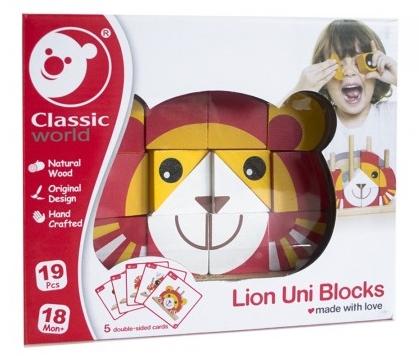Set de cuburi din lemn "Leu" Classic World - format din 19 cuburi de lemn care pot fi combinate pentru a crea diverse obiecte și animale. Ajută la dezvoltarea imaginației și a abilităților intelectuale ale copilului. Jucăria este fabricată din lemn natural, pentru producerea ei se folosesc vopsele sigure.