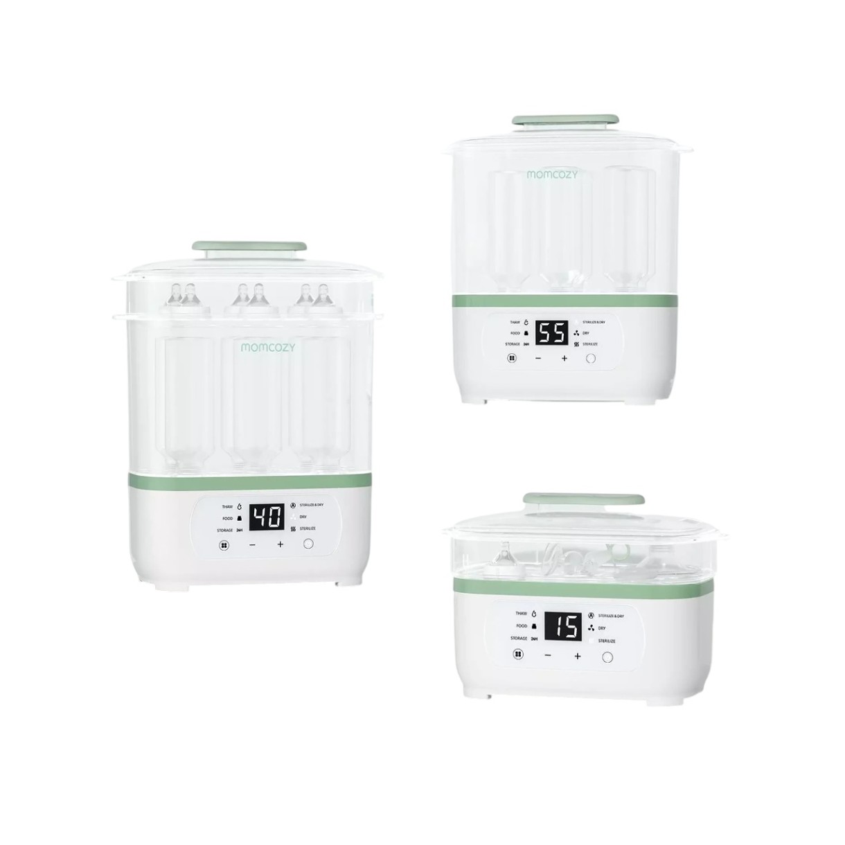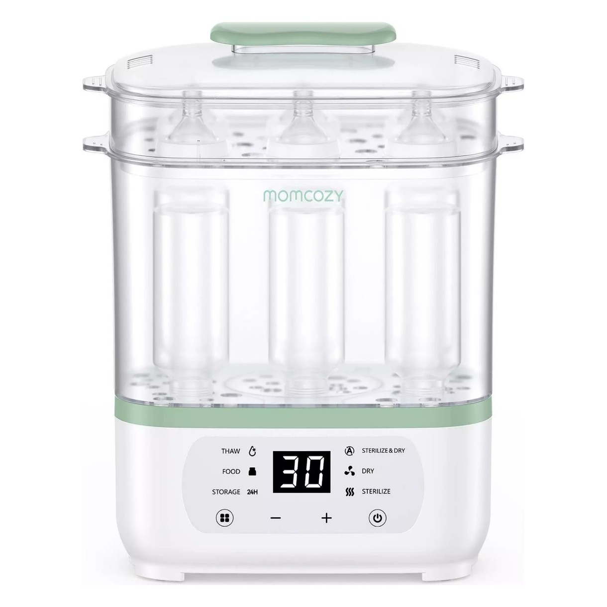 Dispozitiv multifuncțional pentru sticle și hrana bebelușului: sterilizează, usucă, decongelează și încălzește alimentele pentru copii. Cu funcție de depozitare sigură timp de 24 de ore și capacitate de până la 8 sticle, oferă comoditate pentru părinții ocupați.