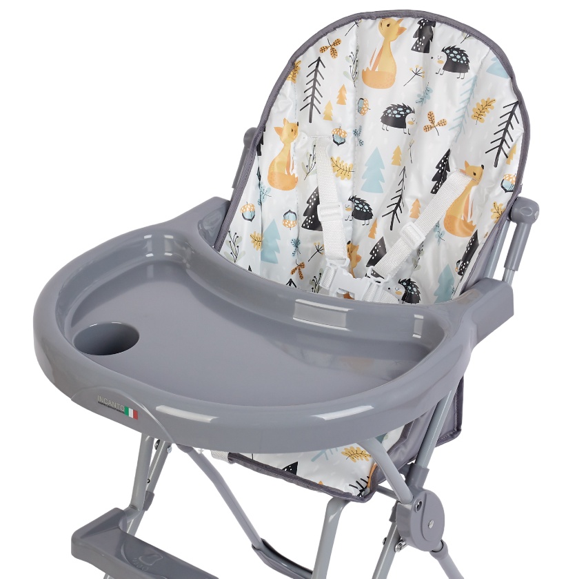 Scaun pentru copii pentru hrănirea Fox Incanto. Scaunul inalt este destinat copiilor de la 6 luni la 3 ani. Menține copilul în poziția corectă, face hrănirea mai confortabilă pentru copil și părinți. Scaunul este realizat din plastic hipoalergenic de inalta calitate, care isi pastreaza aspectul original pentru o perioada indelungata si este usor de curatat. Modelul are o masa mare convenabila, blatul are laturile inalte si locas pentru cana, ceea ce garanteaza usurinta in utilizare. Scaunul foloseste materiale moi care previn ranirea copilului si garanteaza un confort suplimentar, husa este usor de curatat. Hamul în cinci puncte asigură siguranța bebelușului și poate fi reglat în lungime pe măsură ce copilul crește. Designul pliabil facilitează transportul și depozitarea produsului.