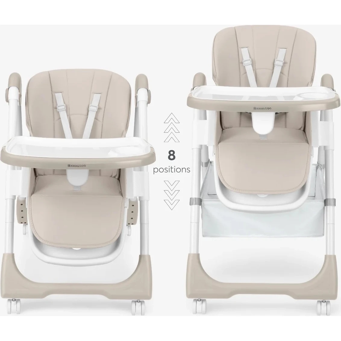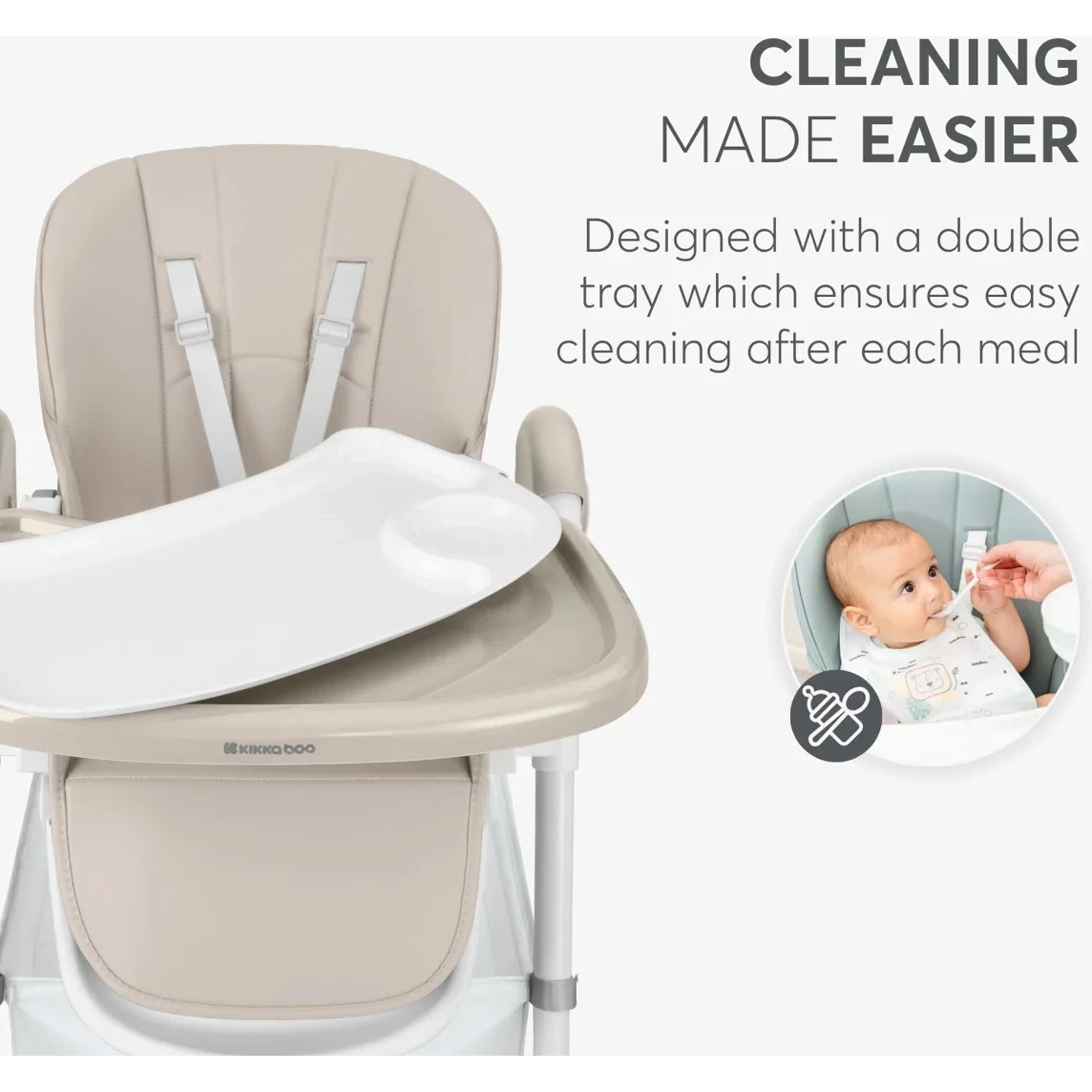 Tăviță dublă practică care include suport pentru pahar și se reglează în 3 poziții. Este ușor de detașat și curățat după fiecare masă;