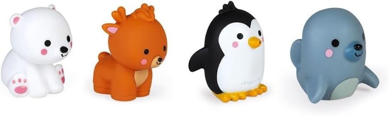 Copilul tău se va juca în baie ore întregi cu aceste 4 animale polare: un urs polar, un pinguin, o focă, o căprioară. Sunt foarte ușor de luat în mână; și apăsând pe cap sau pe burtă, vor scuipa apă!