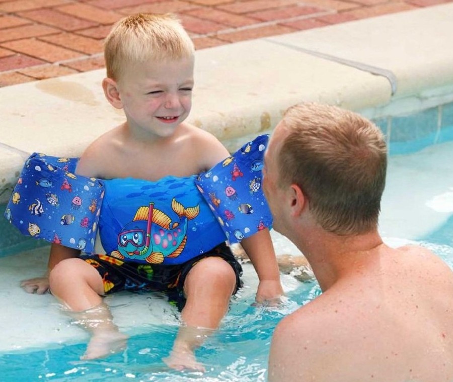 Puddle Jumper — este o vestă de înot confortabilă și sigură, cu mânecuțe, destinată copiilor cu greutatea între 15 și 30 kg. Ajută copilul să se mențină la suprafața apei și să învețe să înoate cu încredere, combinând o centură cu inserție din spumă și mânecuțe detașabile. Designul viu colorat, cu un peștișor simpatic, o face atractivă pentru cei mici, iar închiderea pe spate previne scoaterea accidentală. Este ideală pentru primele aventuri acvatice sub supravegherea unui adult.