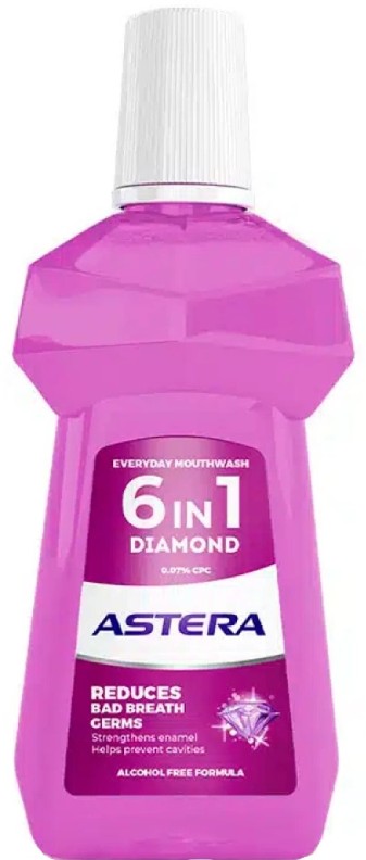 Apa de gură Astera Diamond oferă o îngrijire completă a cavității bucale.