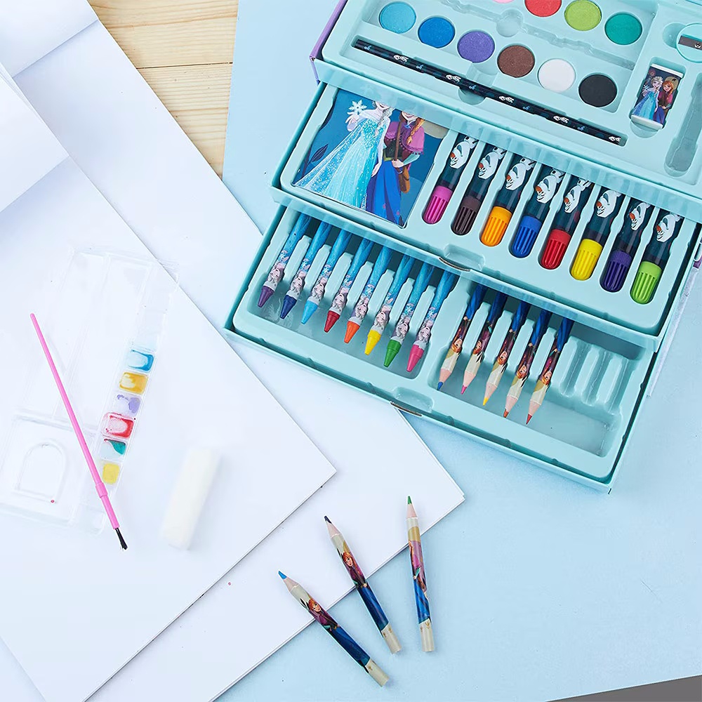 Setul include: o cutie cu trei niveluri, acuarele, o pensula, un burete, un creion negru, o radiera, o ascutitoare, un caiet cu imagini de colorat, 8 markere, 8 creioane colorate, 8 creioane colorate.