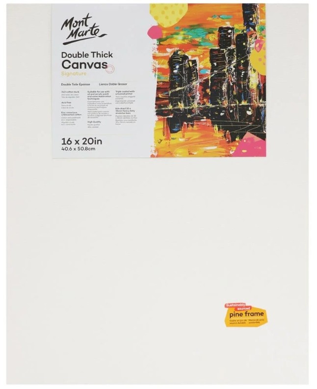 Pânzele Mont Marte Signature Double Thick sunt ideale pentru artiștii începători. Acestea au o ramă cu o adâncime de 36 mm pentru un aspect modern și curat. Nu este necesară înrămarea odată ce pictura este finalizată. Marginile pânzei sunt capsate pe spate pentru un aspect îngrijit. Sunt potrivite pentru aplicații de vopsea ușoară. Pânza ecologică din bumbac este amorsată triplu cu titan acrilic și este gata de utilizare.