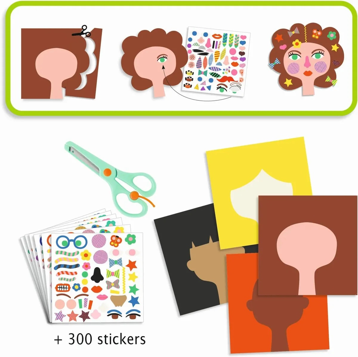 In set4 imagini de bază de caractere, 6 foi de autocolante, 1 foarfecă de siguranță, instrucțiuni