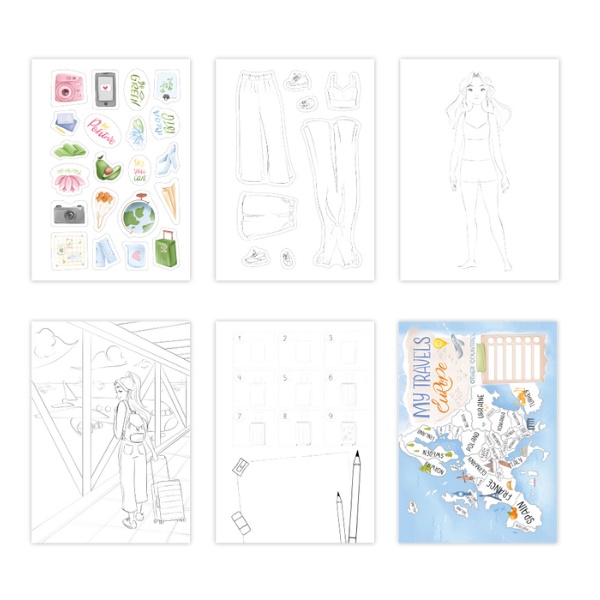 In set1 caiet cu sarcini și ilustrații, 10 markere colorate*, Autocolante și 6 pagini de autocolante de colorat, 15 siluete de fată pentru crearea ținutelor, 4 pagini de colorat, 3 pagini cu desen pas cu pas, 4 pagini cu proiecte de bricolaj, cutie tematică