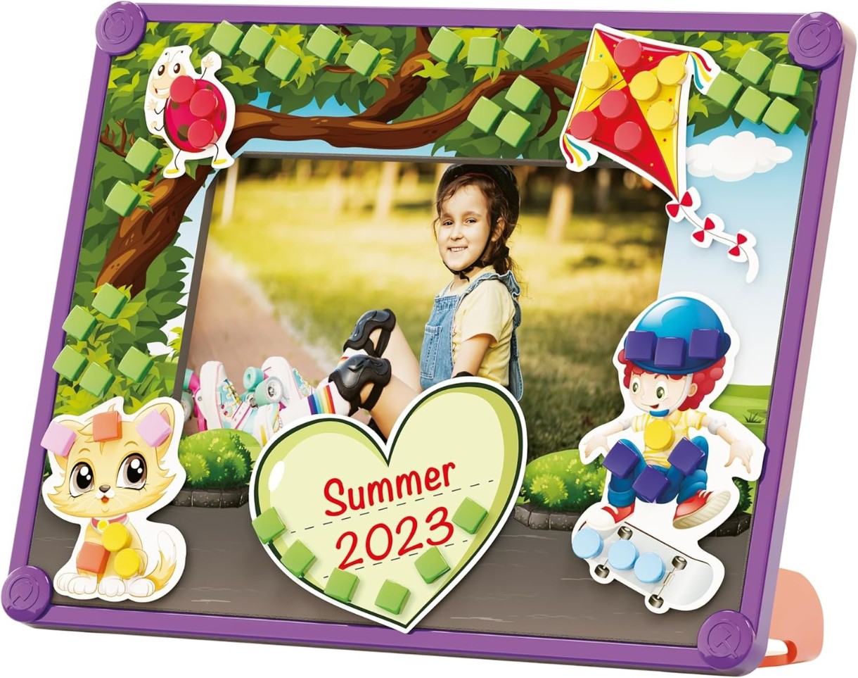 In set1 cadru, 2 picioare, 1 suport foto din carton, 1 cadru de burete, 1 foarfece, 210 ace de 7 culori, rotunde și pătrate, 1 prospect cu rame și ilustrații pentru decupare