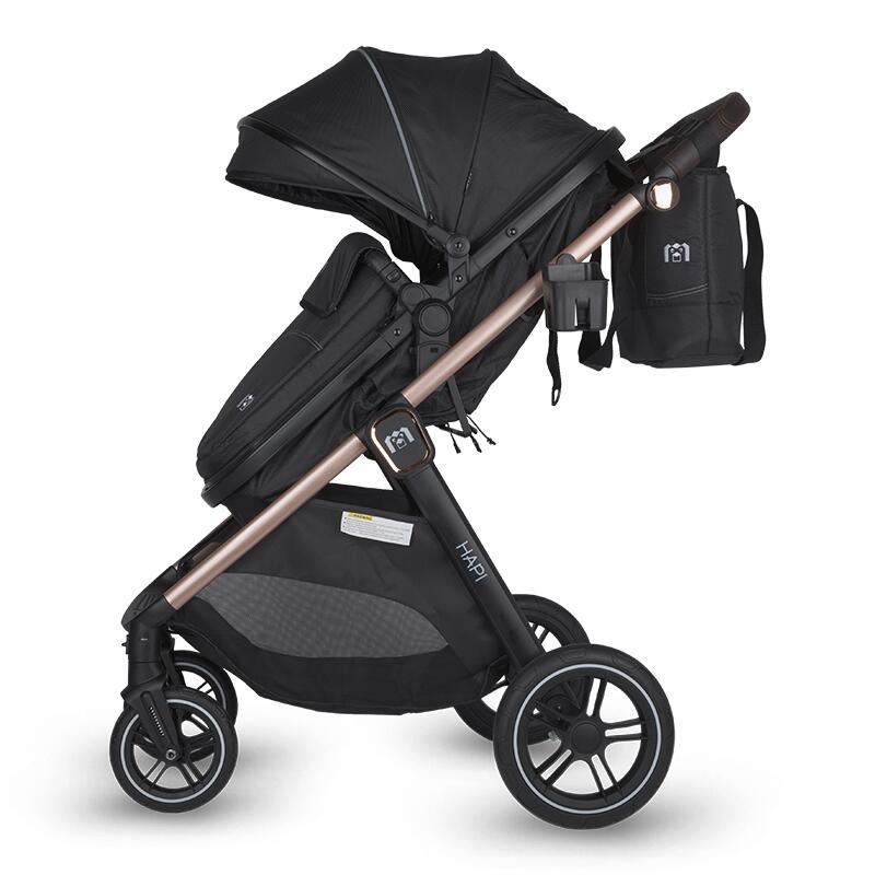 Hapi Soley este echipat cu roți mari din PU, cu jante negre și detaliu alb subtil, pentru o deplasare lină și stabilă pe orice suprafață. Sistemul de frânare este centralizat și intuitiv, iar mânerul reglabil pe înălțime asigură confort părinților, indiferent de statură.