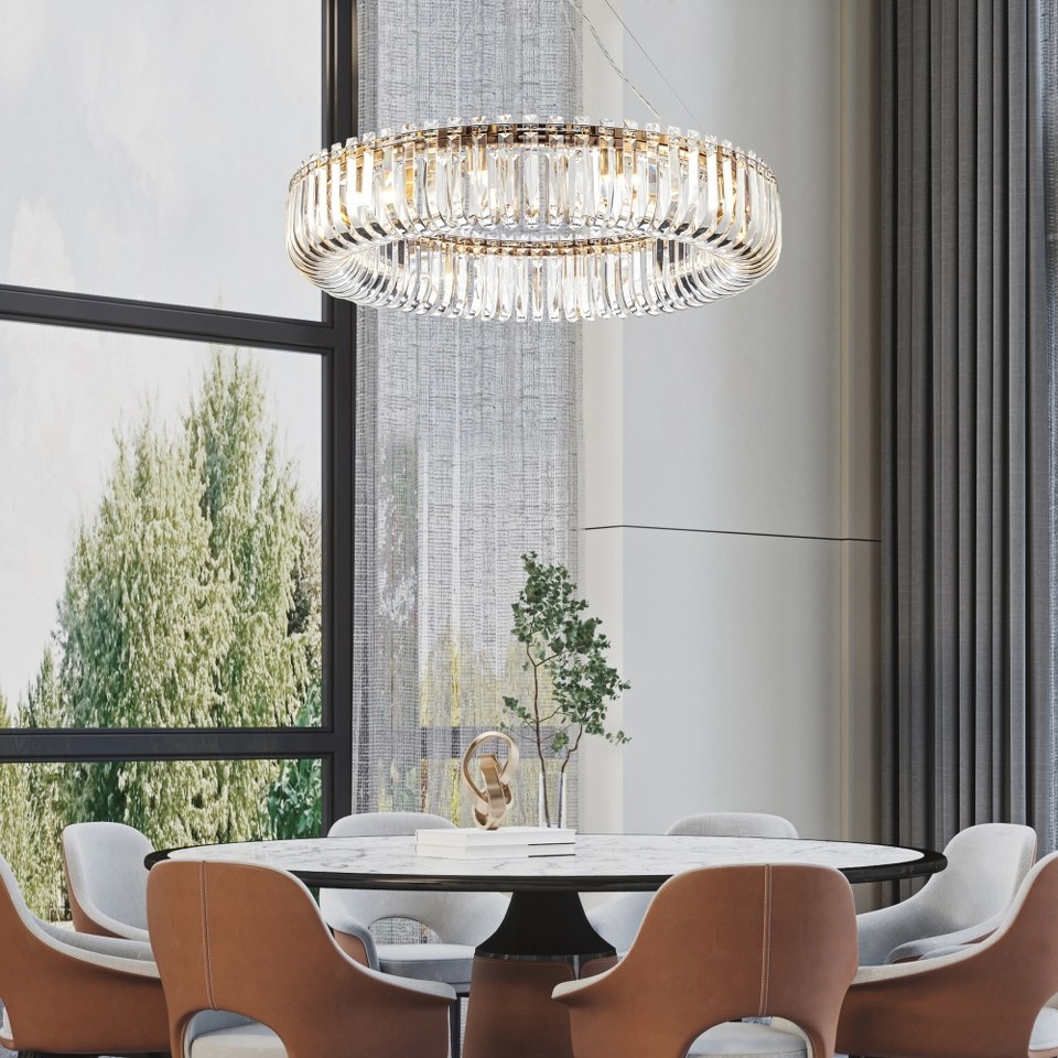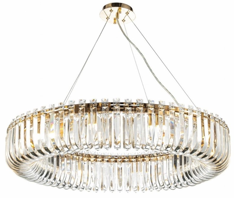 CLN132-D80P este un corp de iluminat suspendat de tavan, remarcat prin structura sa cu finisaj auriu și designul spectaculos cu cristale curbate, care creează un efect luminos orbitor și rafinat. Designul său rotund și modern îl face decorul ideal pentru săli de mese, livinguri, holuri și spații luxoase, unde oferă o iluminare caldă și elegantă. Echipat cu multiple puncte de lumină, asigură o iluminare uniformă și atrăgătoare.
