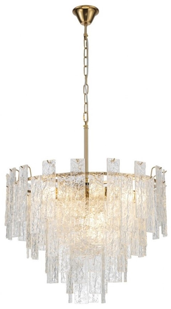 Lampa suspendată CLN133-D60 este un corp de iluminat elegant, caracterizat printr-un design în cascadă cu plăci de sticlă texturată. Structura sa placată cu aur adaugă o notă de lux și rafinament, iar dispunerea elementelor asigură o lumină caldă și difuză. Cu un diametru de 60 cm, acest corp de iluminat este ideal pentru spații precum săli de mese, holuri sau antreuri care caută un echilibru între eleganță și modernitate. Designul său atemporal îl face o alegere versatilă pentru orice tip de decor.