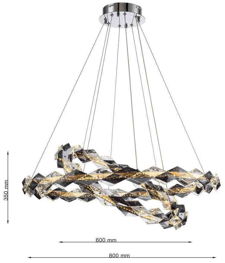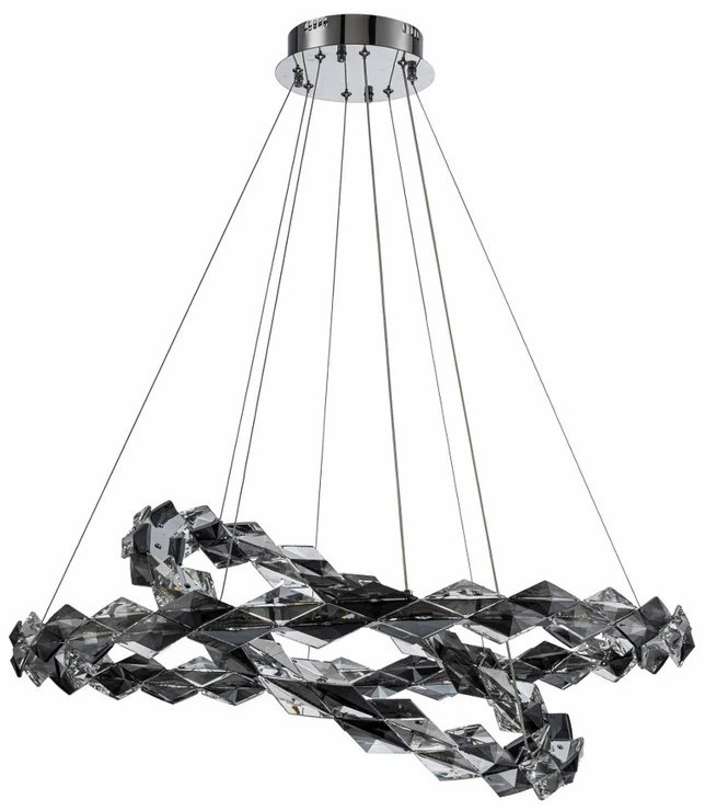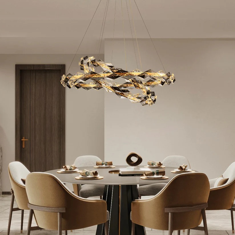 Această spectaculoasă lampă suspendată îmbină arta și tehnologia într-un design cu dublă împletire de inele, creând un efect vizual dinamic și elegant. Structura sa cromată evidențiază cristalele sculptate în nuanțe fumurii și transparente, care captează și reflectă lumina cu o strălucire orbitoare.