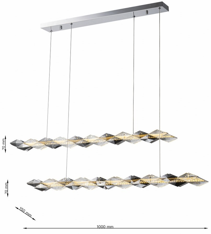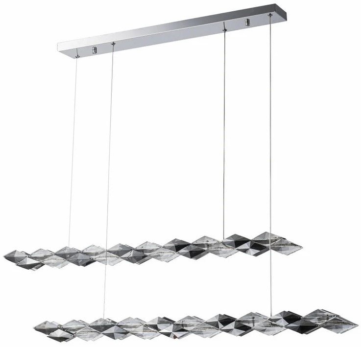 Această elegantă lampă suspendată liniară, pe două niveluri, redefinește iluminatul modern prin combinația rafinată de cristale fațetate în nuanțe fumurii și transparente. Suspendată pe o bază cromată, fiecare tijă este prevăzută cu iluminare LED integrată, care emite o lumină caldă și difuză, evidențiind designul geometric sofisticat al elementelor sale.