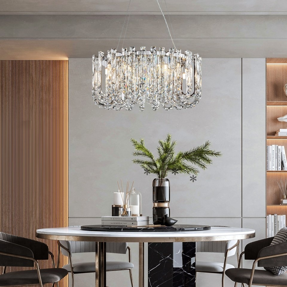 Această lampă suspendată de formă ovală îmbină luxul și rafinamentul datorită structurii sale placate cu aur și cascadei de cristale sculptate care refractă lumina cu o strălucire impresionantă. Formatul său alungit o face ideală pentru mesele de dining, livinguri sau holuri spațioase, creând un punct focal spectaculos. Prin combinarea materialelor de calitate premium și a unui stil modern cu accente clasice, acest corp de iluminat nu doar decorează spațiul, ci îi conferă și un aspect impunător și elegant.