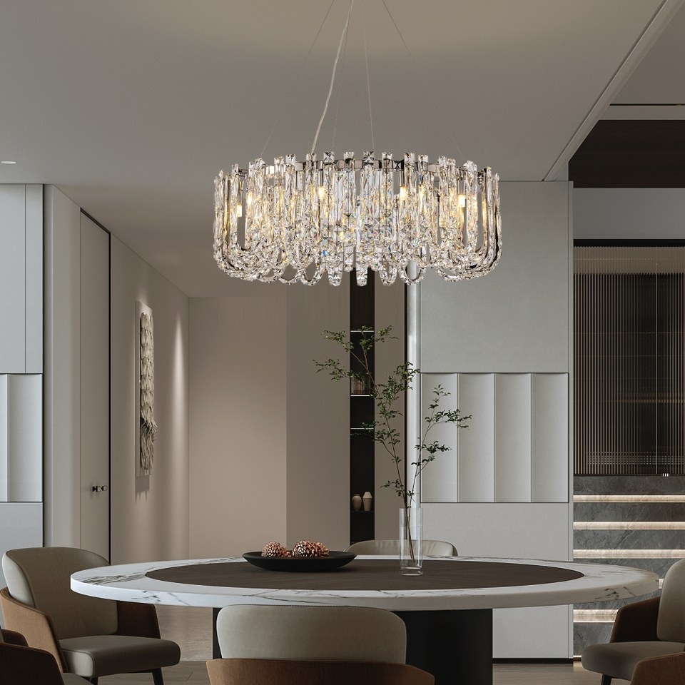 Această impresionantă lampă suspendată ovală îmbină o structură cromată cu un spectaculos șirag de cristale sculptate, creând un efect luminos strălucitor și rafinat. Designul său alungit este ideal pentru iluminarea sălilor de mese, a livingurilor spațioase sau a recepțiilor, oferind un aspect elegant și sofisticat. Combinația de materiale de înaltă calitate și finisajele în tonuri aurii transformă acest corp de iluminat într-o piesă decorativă de impact, capabilă să transforme orice ambient prin strălucirea și stilul său inegalabil.