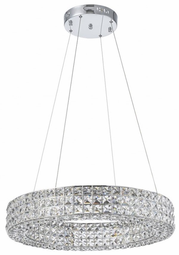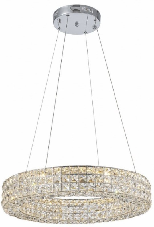 Această lampă suspendată rafinată se remarcă printr-o structură elegantă cromată și un dublu inel din cristale sculptate, care reflectă lumina într-un mod spectaculos. Designul său modern și luxos o face alegerea ideală pentru decorarea sufrageriilor, sălilor de mese și a spațiilor cu un stil contemporan.