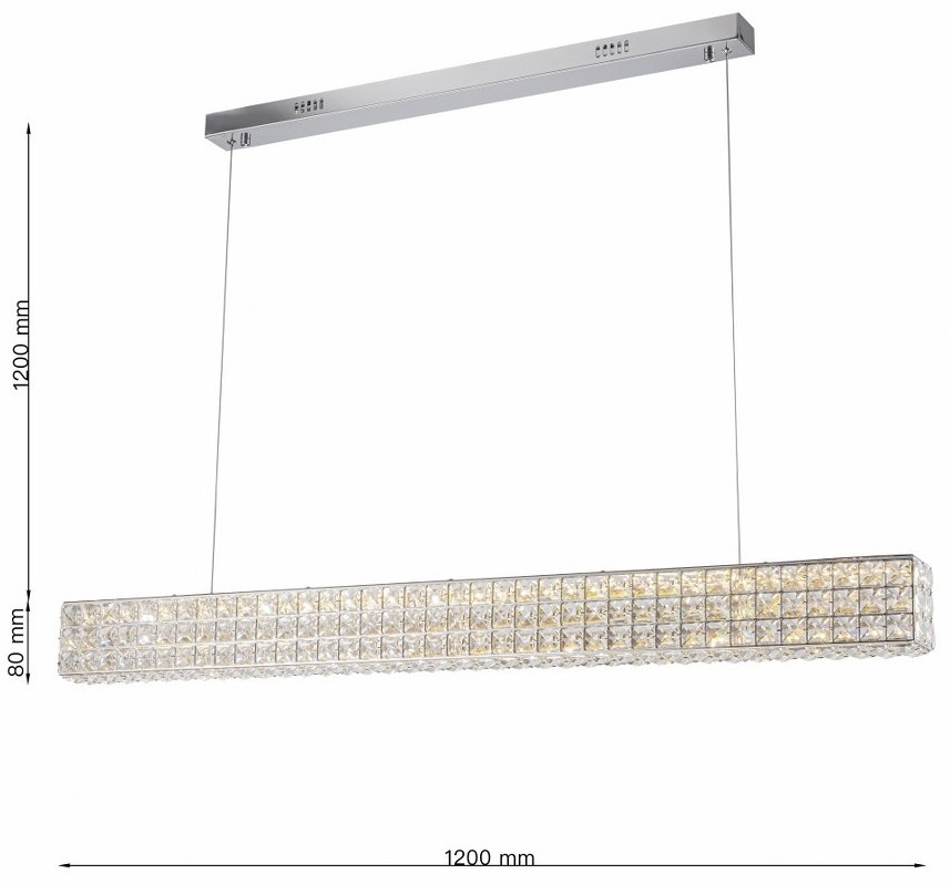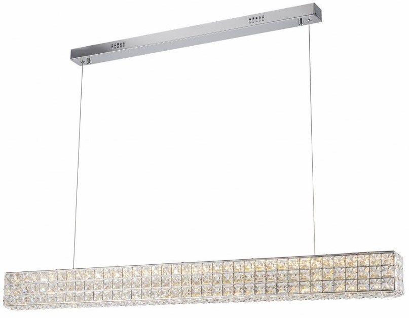 Această lampă suspendată liniară îmbină modernitatea cu rafinamentul datorită structurii sale cromate și suprafeței acoperite cu cristale sculptate, care reflectă lumina într-un mod spectaculos. Construcția sa suspendată asigură o iluminare uniformă și elegantă, fiind ideală pentru mesele de dining, insulele de bucătărie sau spațiile comerciale care doresc să se remarce printr-un stil luxos.