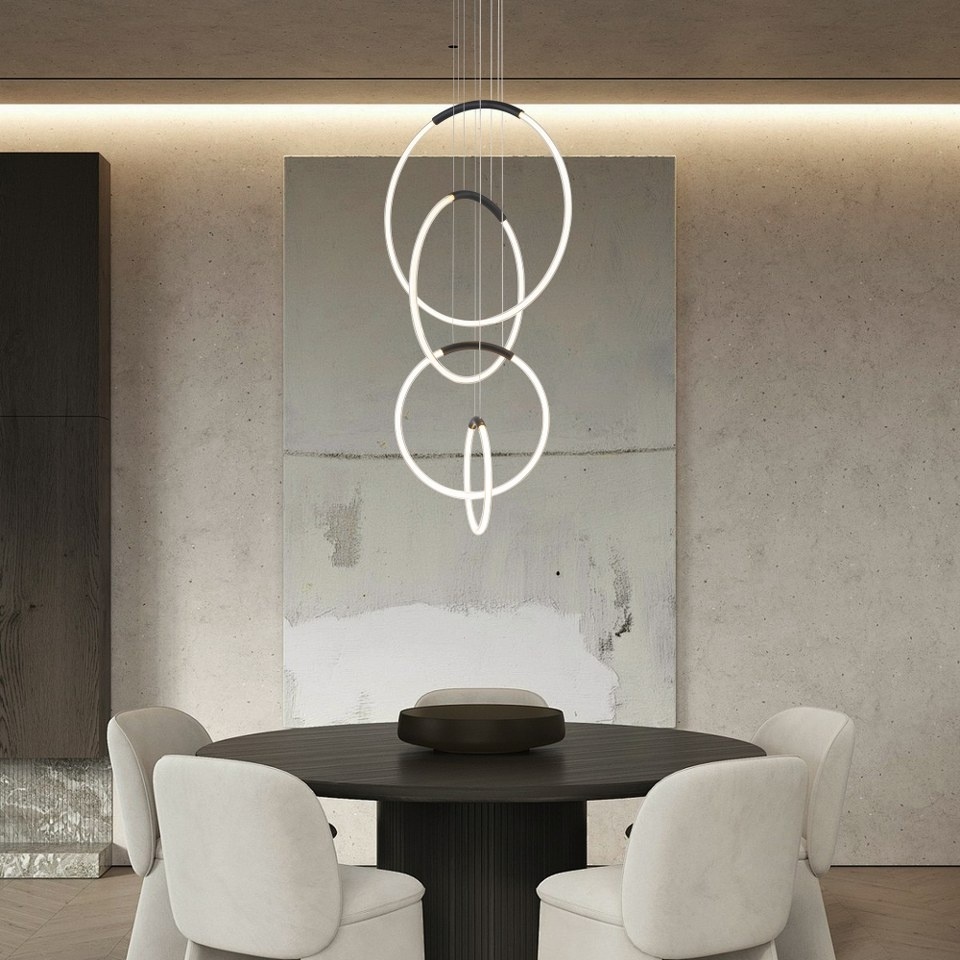 Lampa suspendată LP5209-4P redefinește designul corpurilor de iluminat prin compoziția sa formată din patru inele suspendate la înălțimi diferite, creând o structură dinamică și spectaculoasă din punct de vedere vizual.