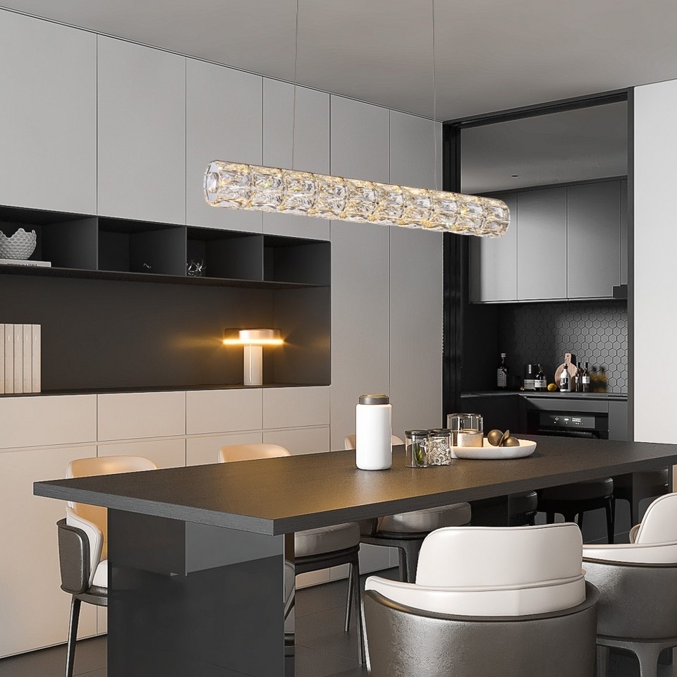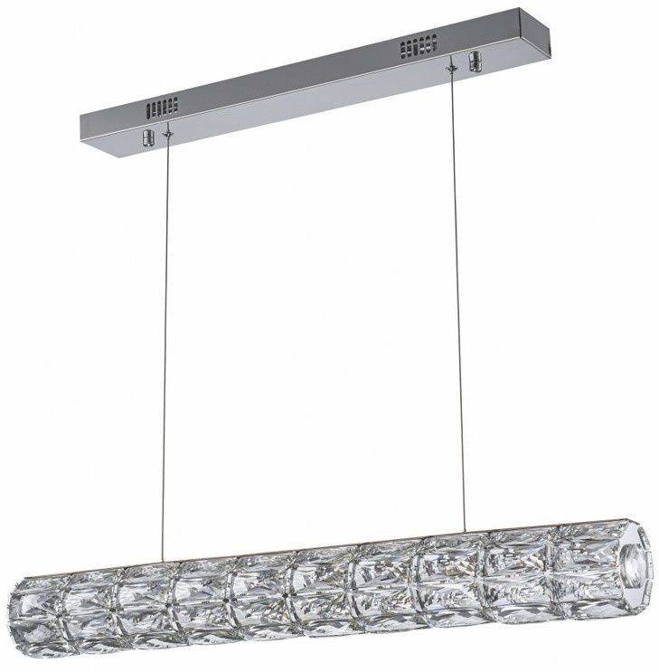 Această lampă suspendată cu LED îmbină un design rafinat cu un cadru cromat și un cilindru din sticlă fațetată, care amplifică lumina, creând un efect luminos și învăluitor. Forma sa alungită o face ideală pentru iluminarea meselor de dining, a barurilor de bucătărie sau a spațiilor de întâlnire în stil modern și luxos.