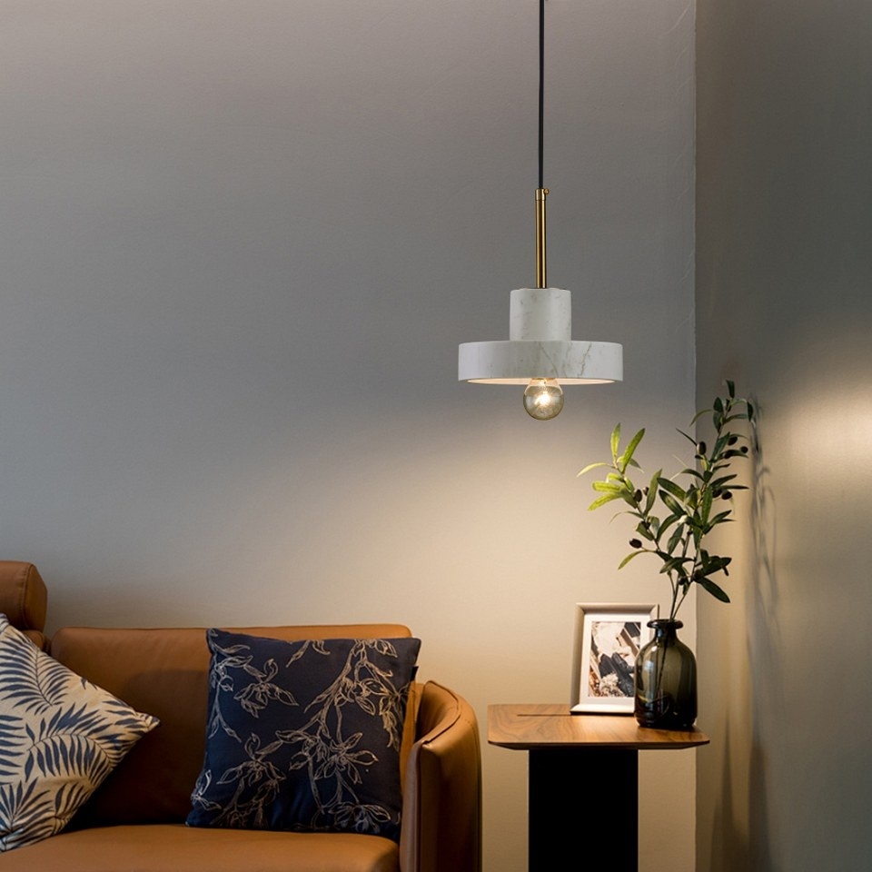 Adăugați eleganță și rafinament spațiului dumneavoastră cu această lampă suspendată modernă, realizată din travertin alb lucios. Designul său minimalist și stilat îmbină materiale naturale cu detalii metalice aurii, oferind un aspect contemporan și luxos.