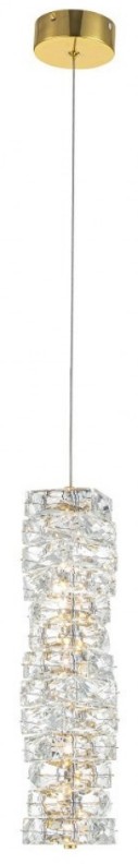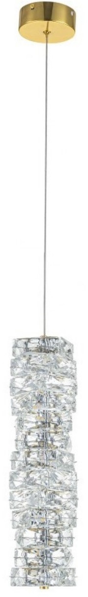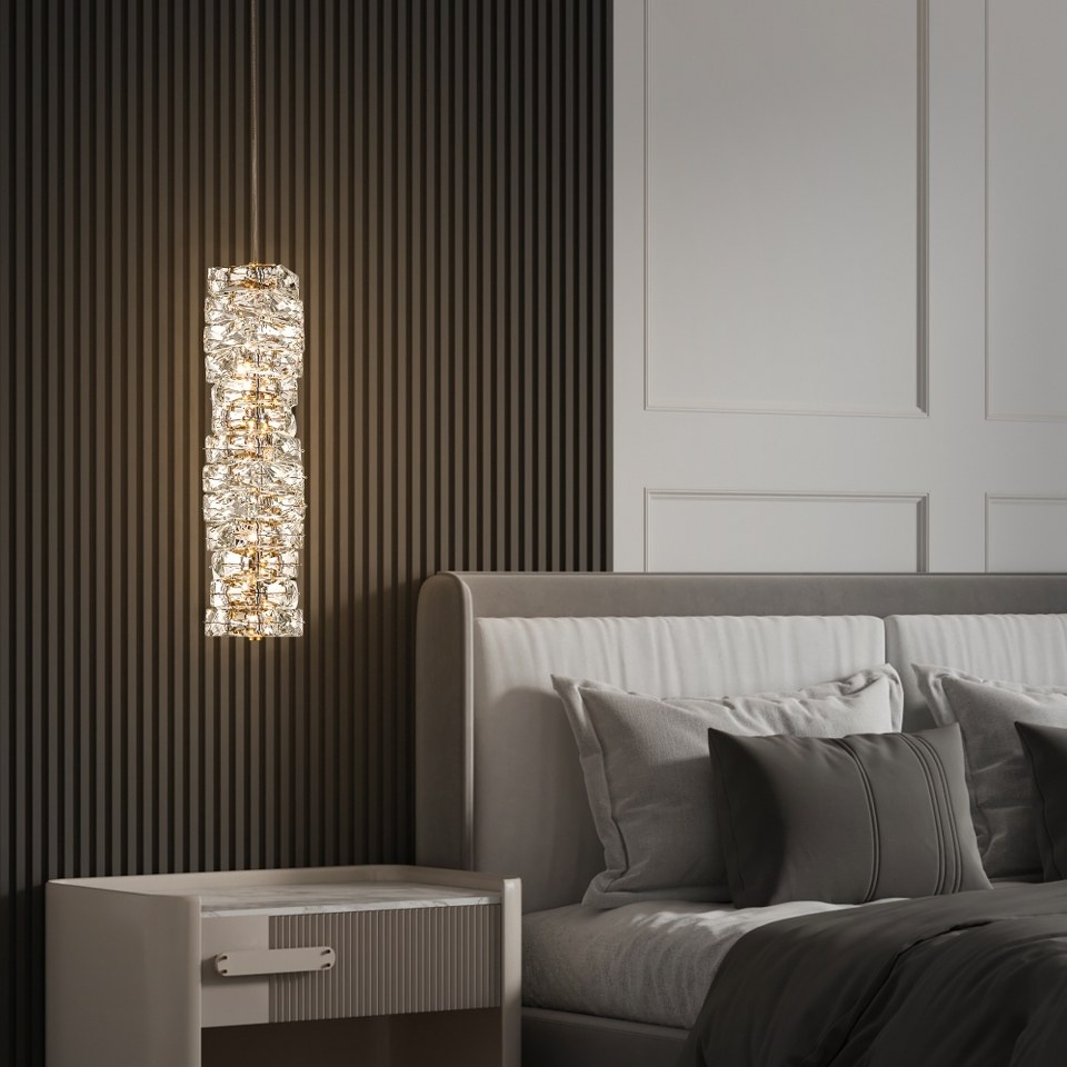 Lampa suspendată LED cu sticlă texturată și detalii aurii este un element decorativ ce îmbină luxul cu modernitatea. Construcția sa alungită evidențiază transparența cristalului, permițând luminii să se refracte spectaculos.