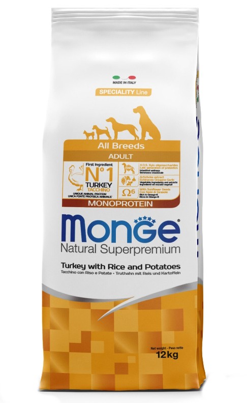 Hrană uscată pentru câini Monge Superpremium All Breeds Adult Turkey/Rice/Potatoes 12kg