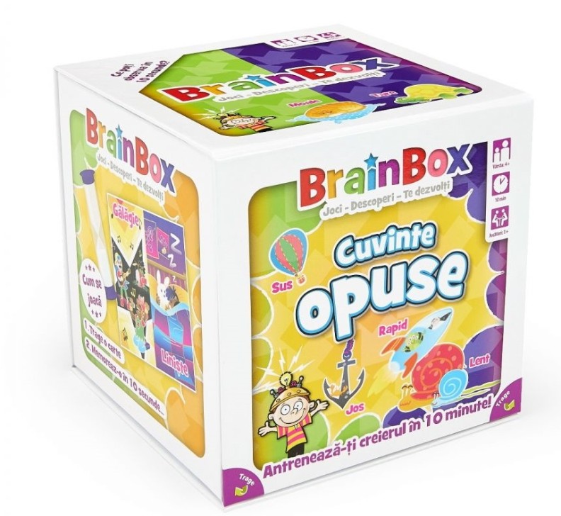BrainBox Cuvinte Opuse - Joc distractiv si educativ pentru copii peste 4 ani BrainBox este un joc de carti distractiv, de memorie si observatie, care testeaza atentia pentru detalii. Ce va puteti aminti in doar 10 secunde? Editia cu antonime contine antonime utile, de zi cu zi, menite sa dezvolte vocabularul jucatorilor BrainBox Cuvinte Opuse contine 55 de carti de joc, fiecare cu termeni sau expresii opuse. Cartile sunt animate prin ilustratii realizate de mâna, care ajuta la evidentierea diferentei dintre notiuni precum Cald si Rece, Repede si Incet, Bine si Rau si multe altele. Jocul ajuta copii sa-si imbunatateasca vocabularul in timp ce si dezvolta memoria si spiritul de observatie, care stau la baza invatarii pe tot parcursul vietii. CU JOCURI DE CUVINTE BAZAT PE ANTONIME: dezvoltati-va vocabularul intelegând intelesul antonimelor in timp ce va imbunatatiti memoria si spiritul de observatie. 330 DE INTREBARI INDIVIDUALE: va puteti bucura de un joc in doar 5 sau 10 minute, dar datorita sutelor de intrebari puteti petrece ore intregi de distractie si niciun joc nu va semana cu celelalte JOC INDIVIDUAL SAU IN FAMILIE: jucati singuri sau cu familia si prietenii. Provocarea este simpla: cât de mult va puteti aminti de pe cartea aleasa in doar 10 secunde DISTRACTIV SI EDUCATIV: BrainBox este creat pentru a fi distractiv, oferind totodata un antrenament pentru memorie, gratie intrebarilor bazate pe memorie si observatie