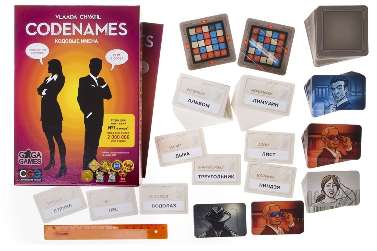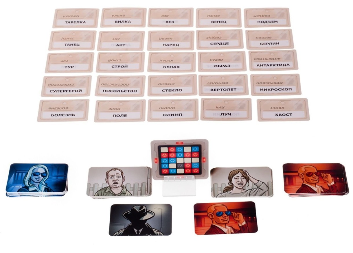 In set200 de cartonașe cu două fețe, 8 cartonașe roșii de agent, 8 carduri de agent albastru, card de agent dublu, 7 cărți de civili, card de ucigaș, 40 de carduri de cheie, stand la cheie, regulile jocului