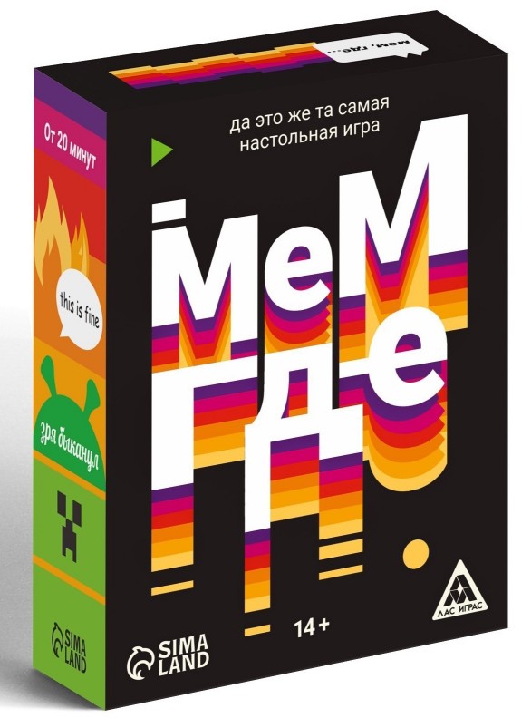 Jocul de societate „Meme, Where” este un joc distractiv și educativ pentru adulți și adolescenți cu vârsta de 14 ani și peste. Setul include 110 cărți colorate cu sarcini și reguli de joc.