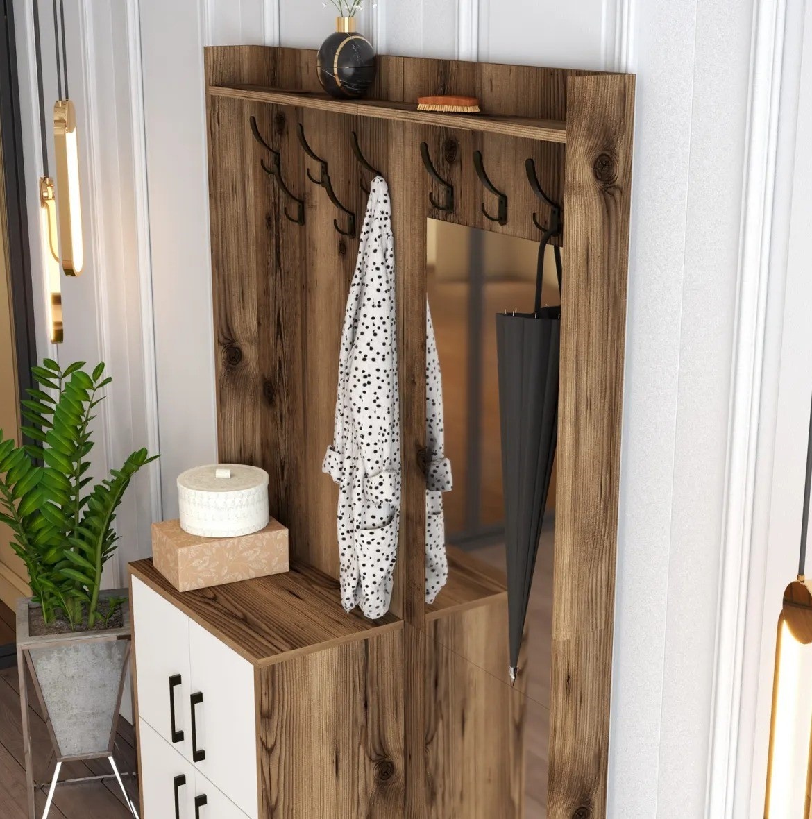 Nu vă mai faceți griji în legătură cu hainele și gențile dezordonate. Suportul de hol include un suport convenabil pentru haine suspendate, permițând agățarea ordonată a hainelor exterioare. Datorită numeroaselor rafturi, pantofii, pălăriile și accesoriile pot fi depozitate cu ușurință, menținând holul ordonat și funcțional.