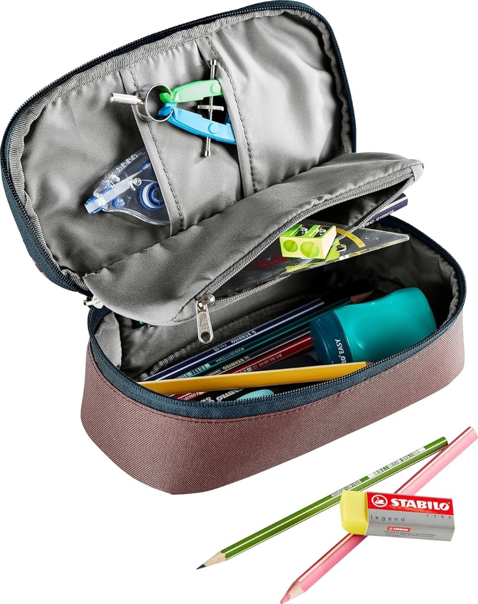 De la riglă, stilou, lipici sau ascuțitoare. În acest penar Deuter, acest lucru este posibil datorită puținelor, dar ingenioaselor obiecte. Se deschide rapid cu fermoarul, totul poate fi găsit la prima vedere, iar pixurile speciale sunt depozitate în bucle, astfel încât acestea să fie imediat la îndemână. De asemenea, nu trebuie să vă confruntați cu scenariul cu triunghiul rupt în penar, deoarece acest penar este, de asemenea, protejat. Acest penar Deuter va fi un companion fidel pe parcursul școlii.