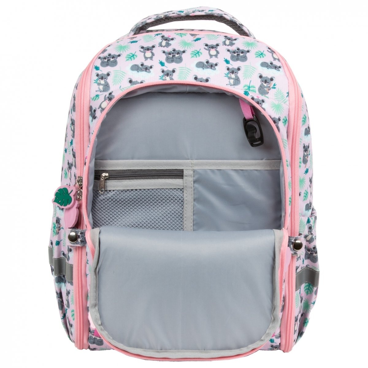 Toată lumea va plăcea acest rucsac de școală spațios și funcțional. Rucsacul se caracterizează printr-o manoperă atentă și un model grozav cu un motiv koala. Materialul din care este confectionat rucsacul este impermeabil si durabil. Rucsacul este incapator, are un compartiment mare si doua buzunare frontale. Compartimentul principal are un buzunar suplimentar pentru laptop sau tabletă și un loc pentru semnătura proprietarului. Buzunarul mai mare are un organizator la îndemână cu o carabină pentru chei, în timp ce buzunarul mai mic este la fel de adânc și va găzdui toate lucrurile mărunte. Pe laterale, rucsacul are două buzunare deschise pentru o sticlă de apă sau o sticlă de apă. Toate fermoarele se termină cu tragători mari și la îndemână. Spatele rucsacului este bine rigidizat și acoperit cu material respirabil. Bretelele de umăr sunt largi, căptușite moale și acoperite cu un material respirabil dedesubt. În plus, rucsacul are o curea de piept reglabilă care ajută la transportul unor sarcini mai grele. Partea inferioară a rucsacului este întărită cu spumă și are picioare din cauciuc care protejează împotriva abraziunii și murdăriei. În partea de sus a rucsacului există un mâner de transport căptușit ușor și un mâner suplimentar pentru agățat. Are reflectoare discrete care vor asigura siguranta pe drum.