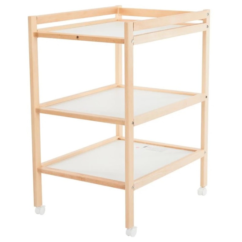 Masa pentru infasat este extrem de practică datorită celor patru rotițe, permițându-i să fie ușor mutată și să se integreze perfect în orice spațiu. Cele două rafturi de depozitare permit să aveți la îndemână tot ce vă trebuie pentru înfășat și îmbrăcat bebelușul.