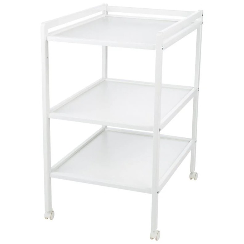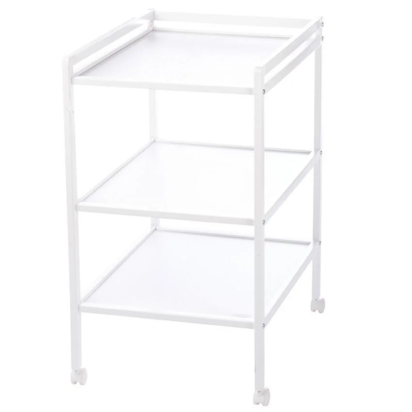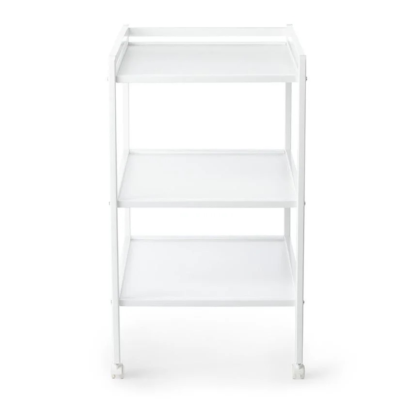 Masa pentru infasat este extrem de practică datorită celor patru rotițe, permițându-i să fie ușor mutată și să se integreze perfect în orice spațiu. Cele două rafturi de depozitare permit să aveți la îndemână tot ce vă trebuie pentru înfășat și îmbrăcat bebelușul.