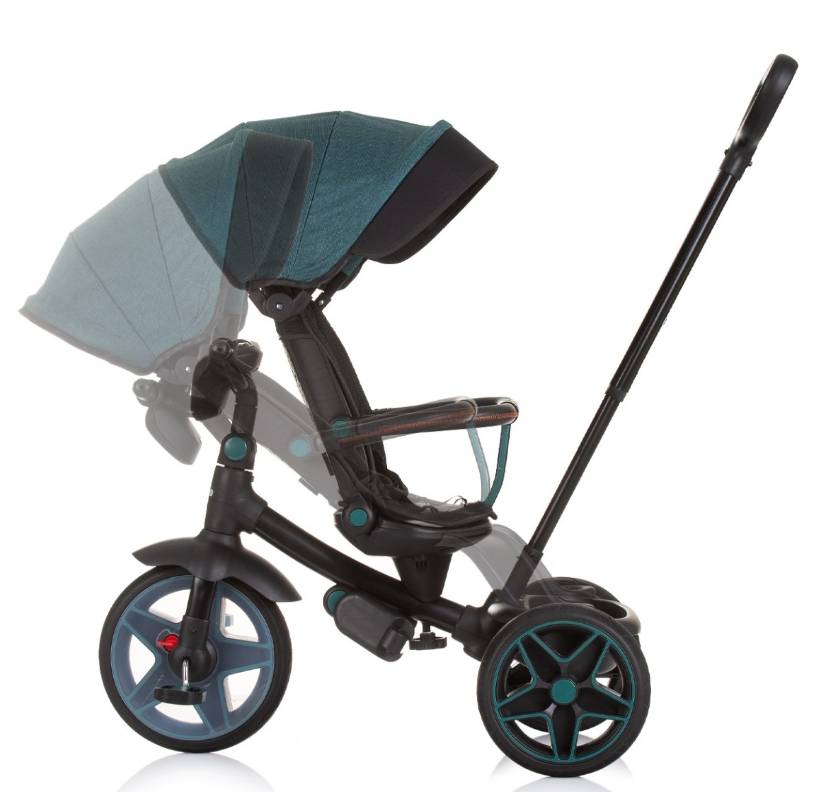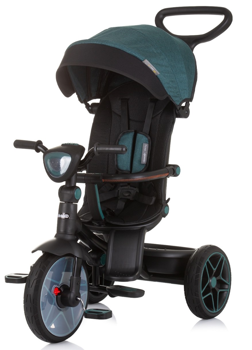 - Capota, manerul si laterala sunt detasabile, iar jucaria se transforma intr-o tricicleta pentru un copil mai mare;