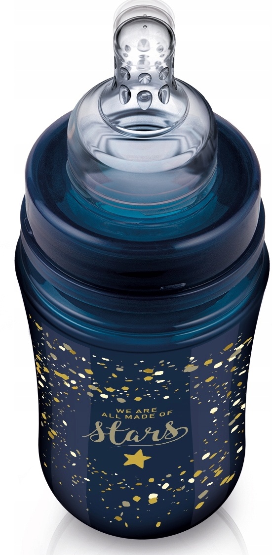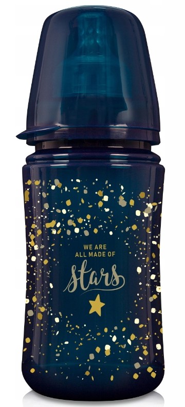 Sticla pentru lapte. Culoarea închisă a sticlei iese în evidență pe piață și, în același timp, vă permite să controlați cantitatea de lapte. Decorat cu stele aurii, evidențiind unicitatea colecției Stardust. Echipat cu un mamelon profesional, moale și dinamic, care îl face sigur pentru bebelușul alăptat - nu interferează cu reflexul de supt. Structura dinamică a suzetei necesită o muncă activă a mușchilor buzelor și a limbii. Este compatibil cu pompele de sân LOVI.